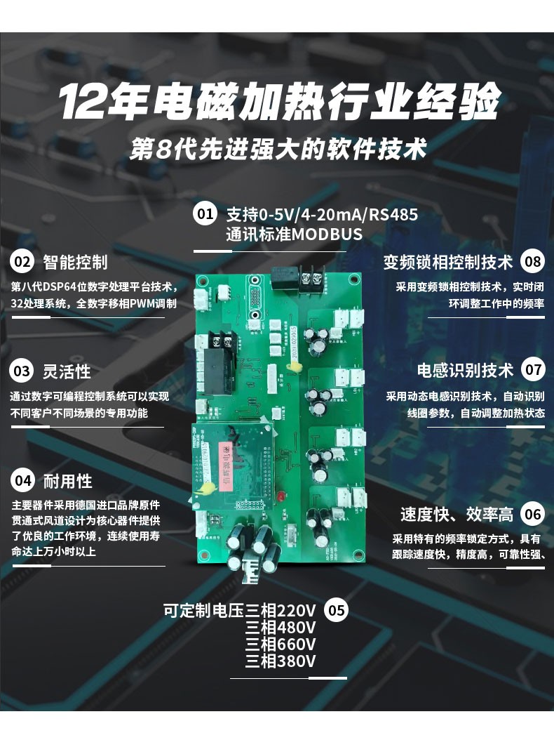 產(chǎn)品簡介: 100-160Kw電磁感應加熱柜由兩部分組成:電磁加熱控制板和電磁加熱線圈。原機受溫度控制的電源[加熱輸出接觸器(或固態(tài)繼電器)輸出端]經(jīng)電磁加熱控制板將工頻交流電整流、濾波、逆變成18~30KHz的高頻交流電,通過連接線接到電磁加熱圈上,高頻交流電透過保溫材料作用于料筒,使料筒本身發(fā)熱。另外,也可以把電源直接輸入到電磁加熱控制板,原有的溫度控制器直接用來控制電磁加熱控制板。